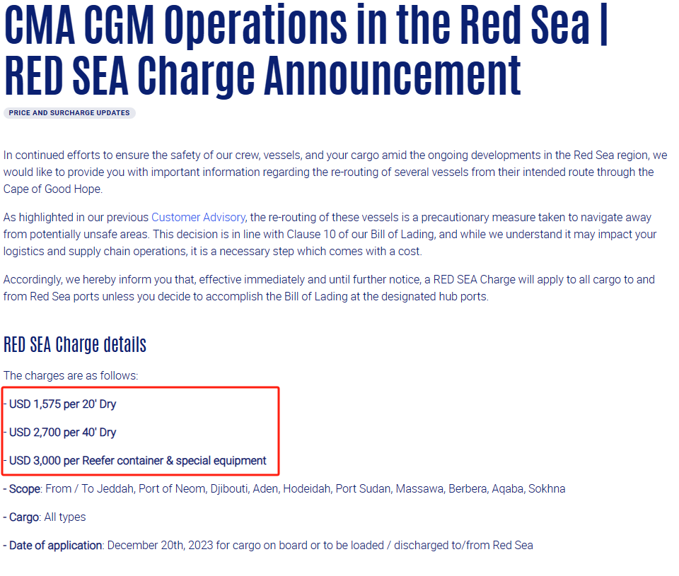 CMA表明,2023年12月20日起,主要用于在船上或裝卸往返紅海的貨物,征繳REDSEACharge“紅海附加費(fèi)”,除非您決定在指定的樞紐港口完成提單,不然全部進(jìn)出紅海港口的貨物將即時(shí)生效,直到另行通知。