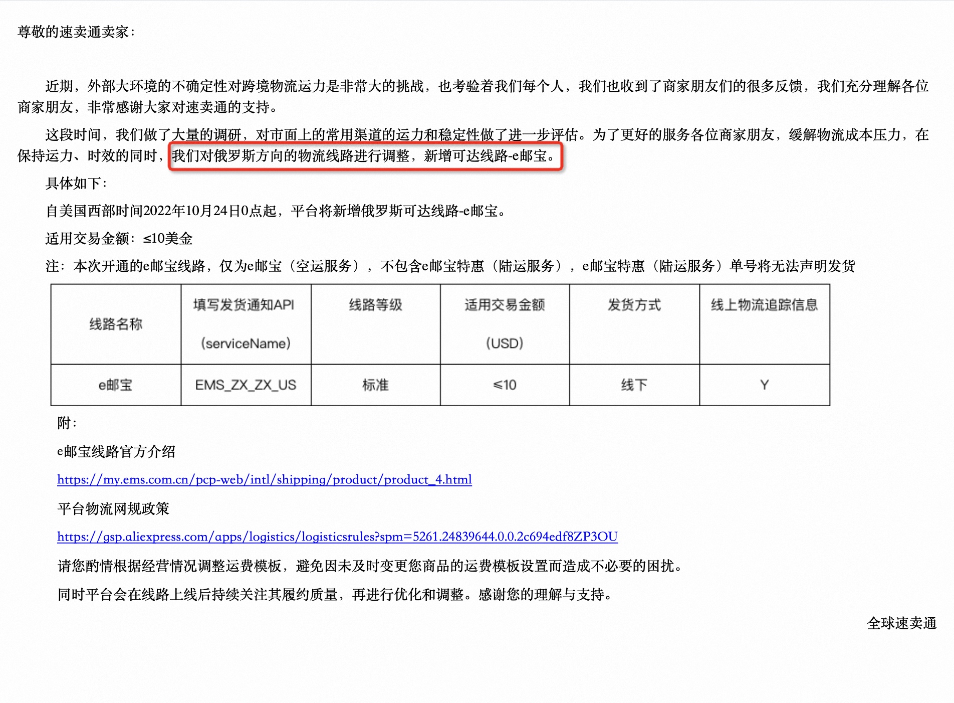速賣通發布最新通知對俄羅斯方向的物流線路進行調整。